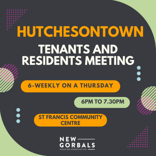 Although we call this the “Hutchie” meeting, it is for anyone for whom St Francis Centre would be their nearest meeting place, as we also have meetings for the Riverside area at Waddell Court and for Oatlands at the Oatlands Community Hub. There is also a Laurieston Estate Action Group who meet at 166 Gorbals Street, near the Citizens Theatre and an online meeting if you prefer getting involved digitally. Find the one that’s right for you and come along. All welcome.